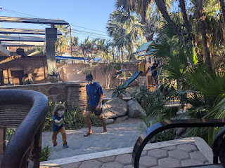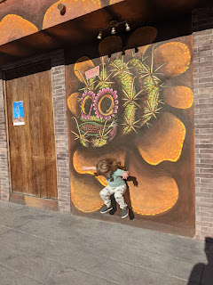 La Esquina (the corner) is a large cafe just down the road from our building. From the outside the building looks like just a wall, as none of the interior features are visible. Once inside the wall though there is a large kitchen, several tables in the main seating area, a playground, and a garden with more tables interspersed. This is probably the nicest atmosphere that we've encountered so far. Louie stayed home for this outing but we made a new dog friend at the restaurant.