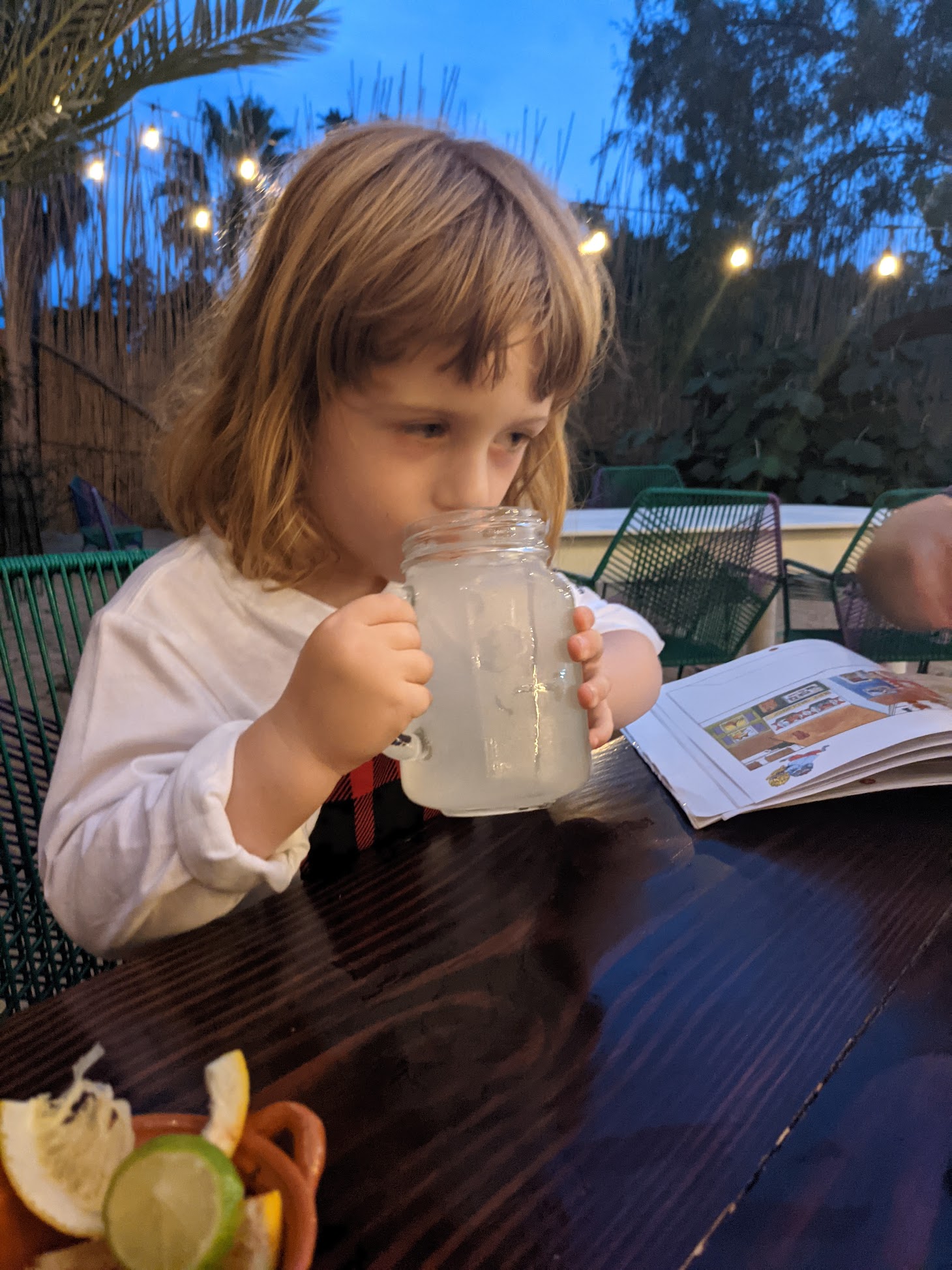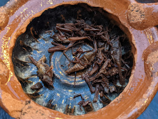 We asked our server about the differences, but he was unfortunately new on the job and hadn't gotten up to speed on all of them yet. The one that he was familiar with had been filtered through a seasoned goat's leg. That was probably interesting enough to cover for all of them. Remy tried some lemonade but wasn't a huge fan. Luckily Dad will drink anything with sugar in it. The mezcal was served with fried crickets. Remy declined the crickets.