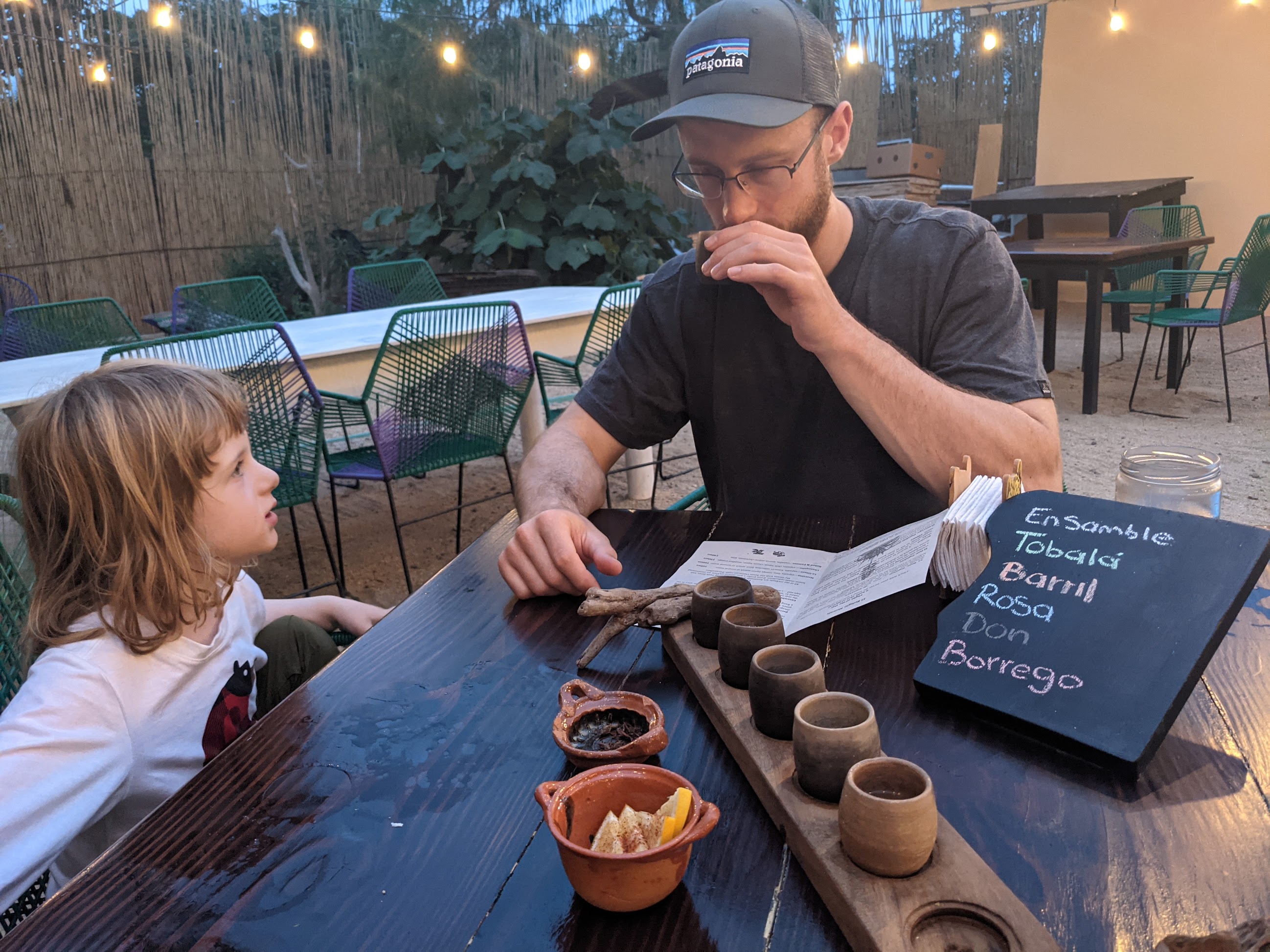 After everyone got a chance to rest we headed into town for dinner. Sunday's dinner was at mezcalria. We know almost nothing about mezcal, but it was interesting to try all of the different varieties. No one in our family is big on liquor alone, but a snifter of mezcal every other month doesn't sound so bad. It didn't have quite the same bite as tequila and seemed to go down a little easier. Maybe that was just the effect of the very fancy clay tasting glasses that the samples came in.