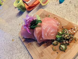 After seeing all those great big fish in the water (okay, okay, dolphins and whales aren't fish), we decided that the only logical dinner choice was sushi! We went back to Noah's rooftop restaurant for some excellent sashimi.
