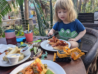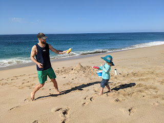 Remy and Dad had a water fight using the ketchup and mustard squirters that Mom acquired from the grocery store. They double as excellent tools for putting sauce on all of Remy's sandy beach recipes.