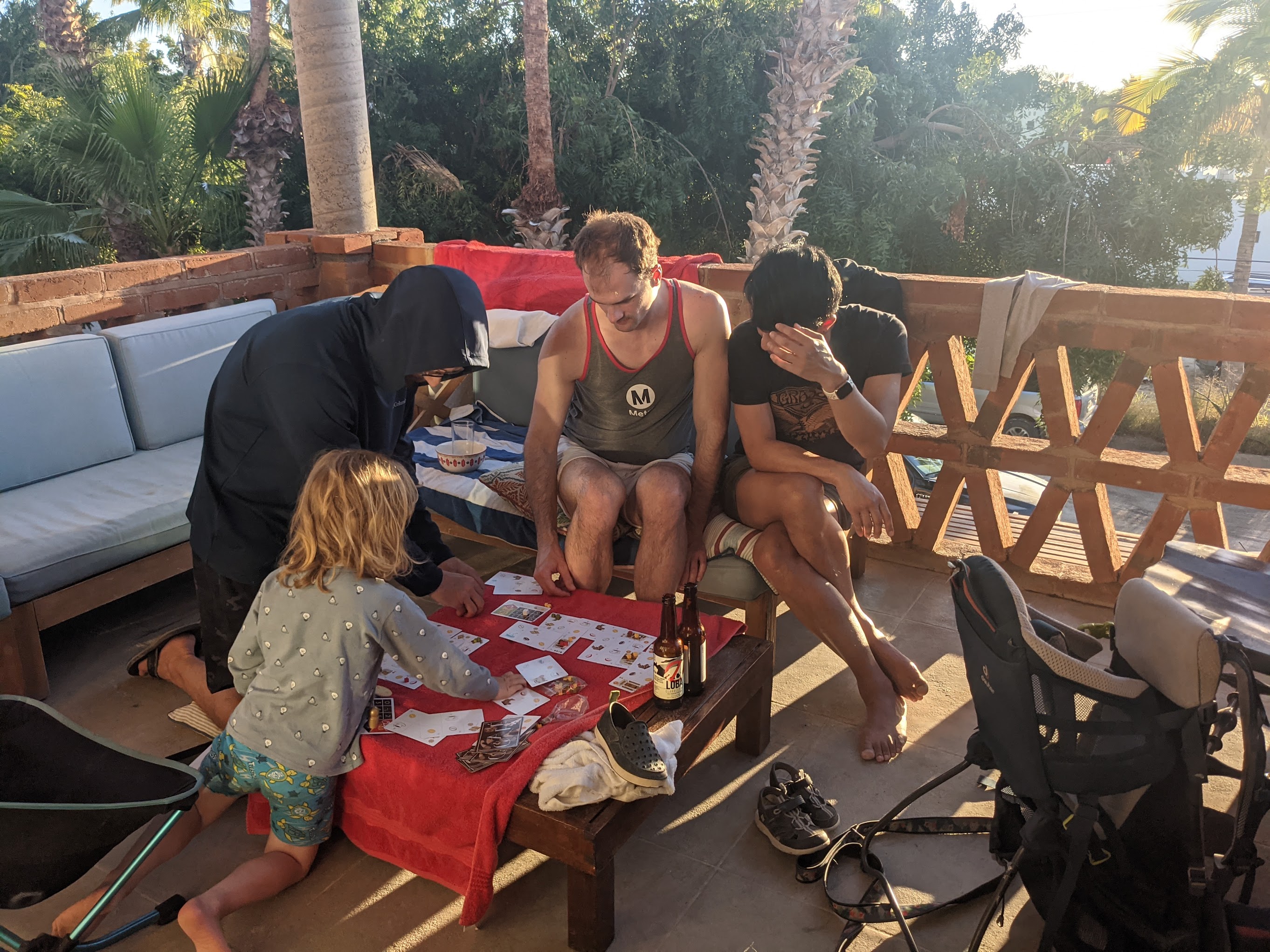 During naptime Dad, Alec, and Lucas played some boardgames. When Remy woke up he was eager to join in. He definitely had the most coffee beans in his warehouse.